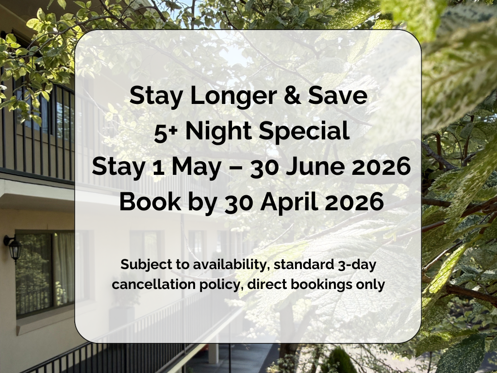 Stay 5 nights or more from 1 May – 30 June, 2026 and save. Book in your stay before 30 April, 2026 to secure this deal when booking direct only in our Studio Apartments or 2-Bedroom Standard Apartments.